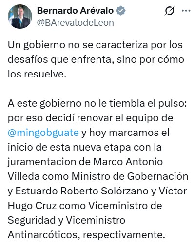 En el mismo texto anunció la juramentación de Marco Antonio Villeda como nuevo ministro de Gobernación, junto a Estuardo Roberto Solórzano y Víctor Hugo Cruz como viceministros de Seguridad y Antinarcóticos.