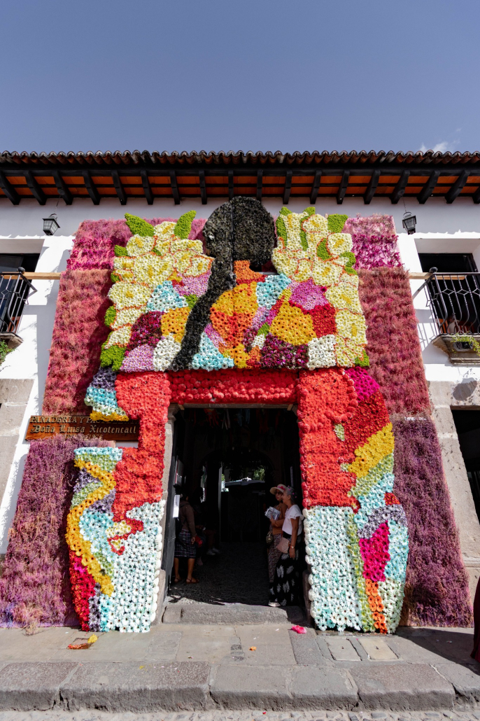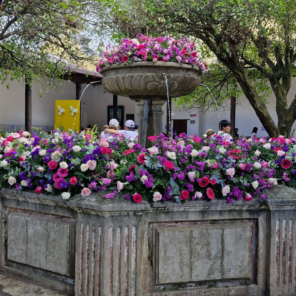Las calles empedradas, fachadas coloniales, fuentes centenarias y corredores históricos fueron intervenidos con tapices florales, esculturas botánicas y composiciones elaboradas por artistas, estudiantes y colectivos comunitarios.