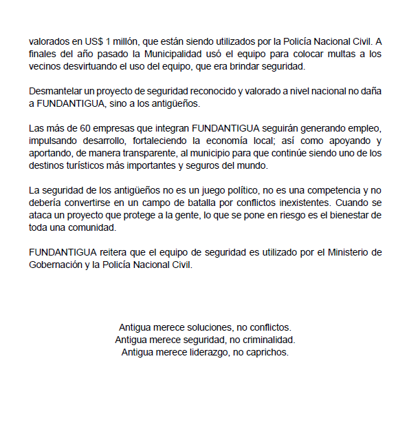 Alrededor de sesenta empresas que constituyen FUNDANTIGUA señalan como preocupante que Juan Manuel Asturias continúe «destinando tiempo y recursos para atacar un proyecto de seguridad exitoso».