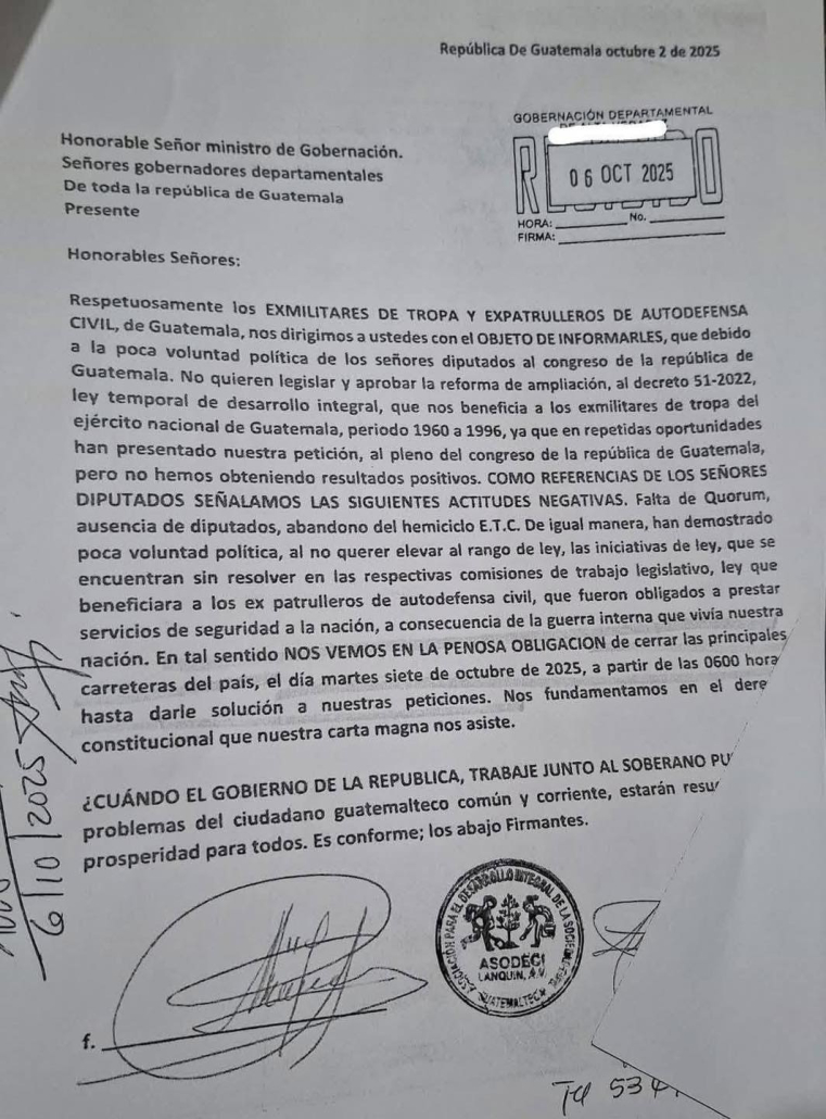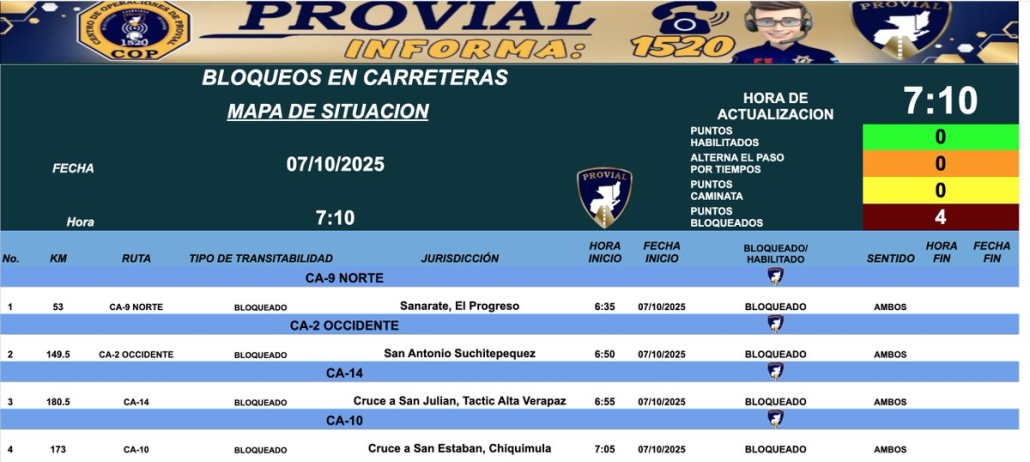 La Dirección General de Protección y Seguridad Vial (Provial) reportó este martes por la mañana al menos cuatro bloqueos en distintas carreteras del país, protagonizados por grupos de expatrulleros y exmilitares que exigen al Congreso la aprobación de reformas al Decreto 51-2022, conocido como Ley temporal del desarrollo integral.