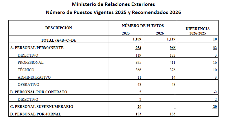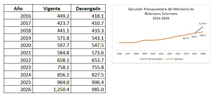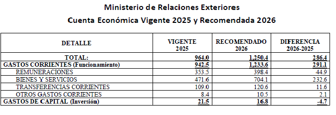Para el ejercicio fiscal 2026, el Organismo Ejecutivo ha solicitado un presupuesto de Q1,250.4 millones para el Ministerio de Relaciones Exteriores, teniendo un incremento de Q286.0 millones respecto al presupuesto vigente a octubre de 2025.
