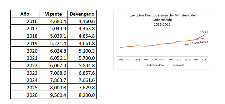 El Proyecto de Presupuesto elaborado por el Ministerio de Finanzas Públicas contempla una asignación de Q9,560.4 millones en favor del Ministerio de Gobernación, reflejando un incremento de Q1,559.6 millones respecto al presupuesto vigente a octubre de 2025. Si bien está claro que una de las funciones principales del gobierno es brindar seguridad a la población, cabe destacar que de acuerdo con el comportamiento de ejecución de 2016 a 2025, el monto propuesto para 2026 no es congruente con la capacidad de ejecución mostrada por el Ministerio de Gobernación.