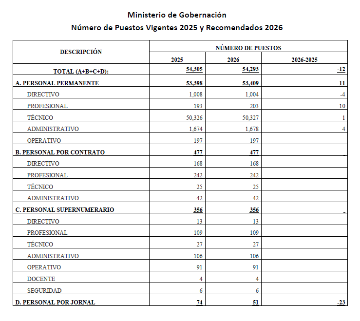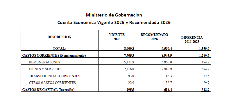 Respecto a las remuneraciones, tienen un aumento de Q494.2 millones, sin embargo al analizar la cantidad de personal que se espera tener para 2026, el aumento en este rubro puede indicar que el Organismo Ejecutivo creó un bolsón presupuestario, o bien, quiere otorgar un aumento salarial al personal del Ministerio de Gobernación, ya que comparando la cantidad de personal para 2025 respecto a la esperada para 2026, se tiene una disminución de 12 personas, es decir, que la nómina se mantiene prácticamente de la misma manera.