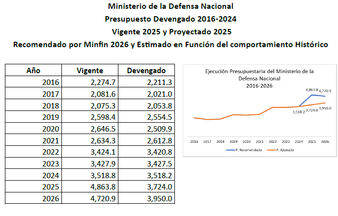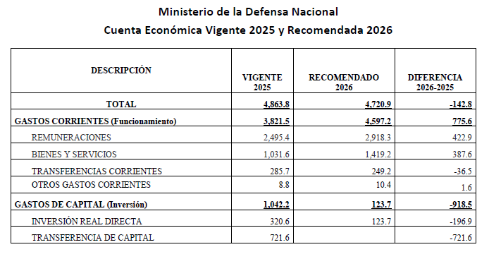 Lo que es importante destacar en el presupuesto del Ministerio de la Defensa Nacional, es el hecho que, pese a que el monto propuesto para 2026 es menor al vigente 2025, a lo interno de los principales rubros se observan incrementos tanto en las remuneraciones como en los bienes y servicios.