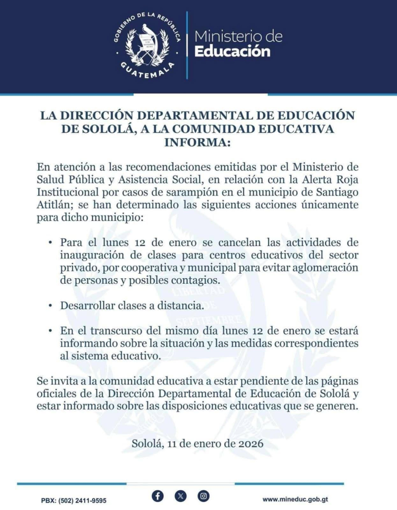 Asimismo, se pidió a los establecimientos educativos extremar la vigilancia ante síntomas como fiebre, erupciones en la piel, secreción nasal u ojos enrojecidos, y reportar de inmediato cualquier caso sospechoso a las autoridades de salud y educación, además de suspender temporalmente la asistencia del estudiante afectado.