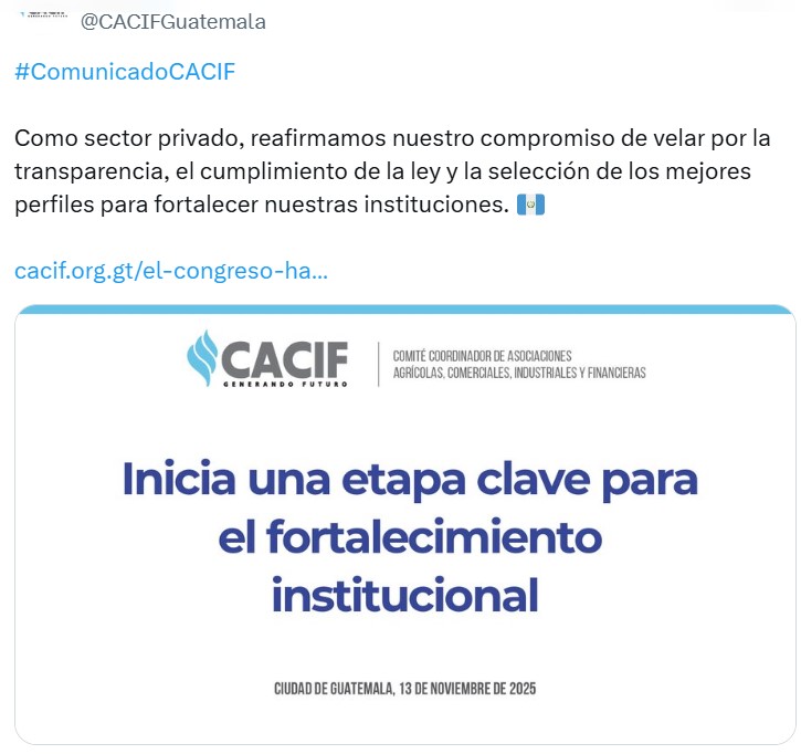 CACIF sostiene que la renovación institucional de 2026 representa un punto de inflexión para fortalecer el sistema democrático del país y recalca que “Guatemala necesita que los mejores perfiles asuman la responsabilidad de dirigir las instituciones públicas”.