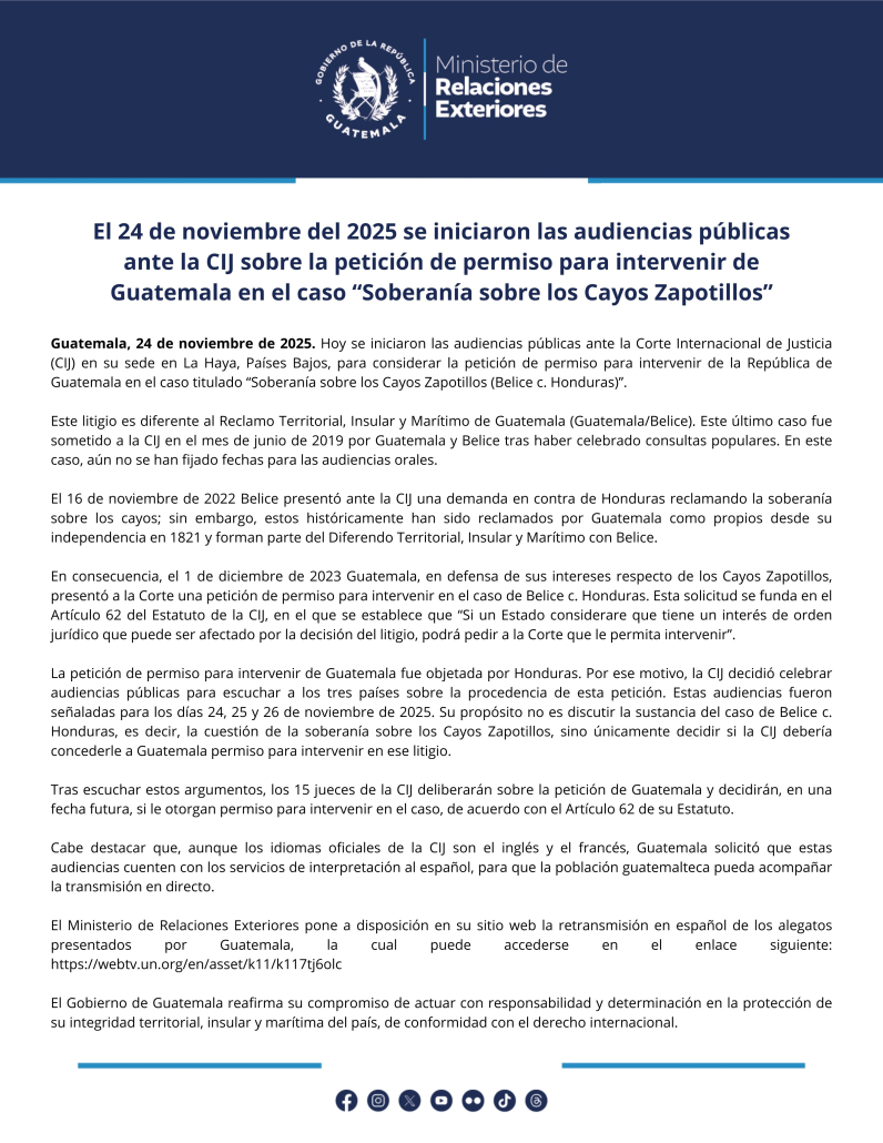 La Corte Internacional de Justicia (CIJ) abrió este 24 de noviembre de 2025 las audiencias públicas para analizar la petición de Guatemala de intervenir en el litigio “Soberanía sobre los Cayos Zapotillos (Belice c. Honduras)”, un reclamo que volvió a escena después de que Belice demandara a Honduras en 2022 por la posesión del archipiélago.