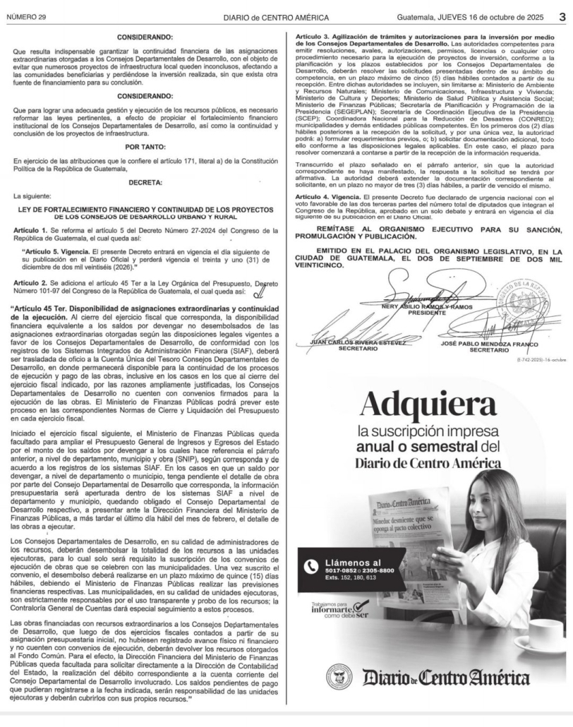 El Decreto 7-2025, llamado Ley de Fortalecimiento Financiero y Continuidad de Proyectos de los CODEDES, permitirá a los Consejos Departamentales de Desarrollo ejecutar saldos no utilizados del presupuesto anterior, bajo el argumento de garantizar la continuidad de obras locales.