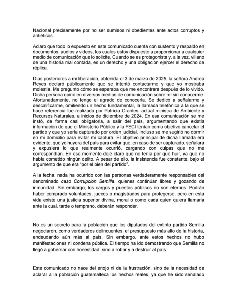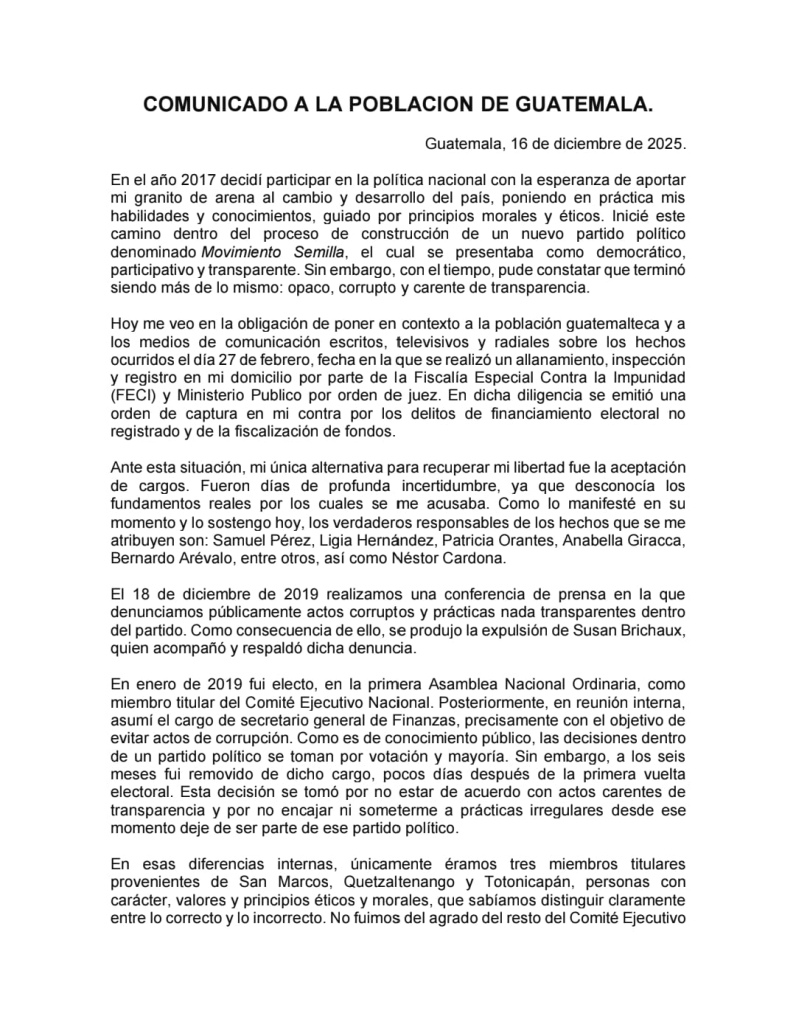 En el pronunciamiento, fechado el 16 de diciembre de 2025, Batz Chuc afirma que su participación política inició en 2017 con la intención de aportar al desarrollo del país, pero que con el tiempo constató que Semilla terminó reproduciendo prácticas “opacas, corruptas y carentes de transparencia”.