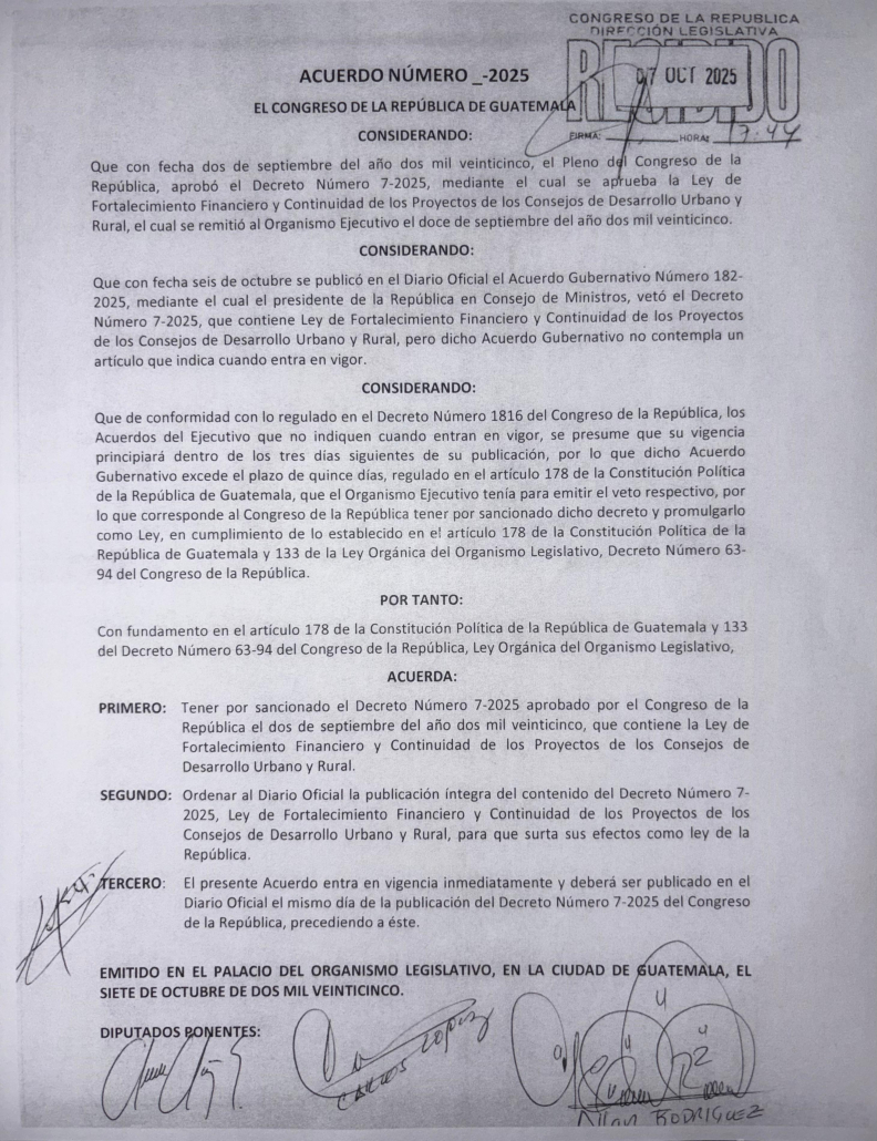 El Congreso de la República declaró sancionado el Decreto 7-2025, que aprueba la Ley de Fortalecimiento Financiero y Continuidad de Proyectos de los Consejos de Desarrollo Urbano y Rural (Codedes), argumentando que el veto presidencial fue presentado fuera del plazo constitucional.