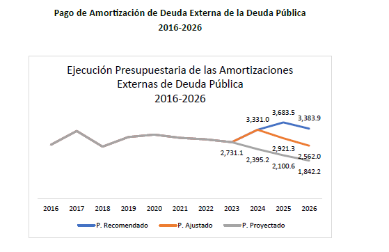 De haberse mantenido la tendencia, en 2024 el pago de amortización externa debió posicionarse en Q2,395.2 millones, con lo cual el 2025 sería Q2,100.6 millones y el 2026 quedaría con Q1,842.2 millones. Sin embargo, dado el cambio en la ejecución de 2024, el cierre de 2025 estaría en aproximadamente Q2,921.3 millones y por lo mismo se propone que para 2026 el monto sea de Q2,562.0 millones, implicando una disminución de Q822.0 millones respecto al monto programado por el Ministerio de Finanzas Públicas para dicho año.