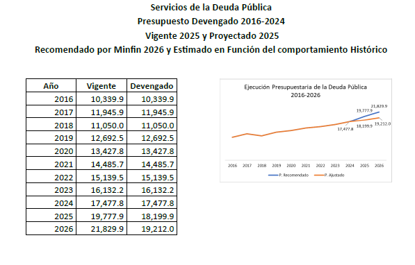 Para 2025 el presupuesto autorizado para deuda pública asciende a Q19,962.1 millones, posteriormente, con la aprobación del Decreto 1-2025, que amplió el presupuesto 2025, se incrementó el presupuesto de la deuda pública en Q200.0 millones. monto que al parecer no era necesario y únicamente fue asignado como un bolsón presupuestario, ya que a octubre de 2025 el monto vigente para pago de deuda es de Q19,777.9 millones, es decir, se disminuyeron los Q200.0 millones autorizados en el Decreto 1-2025 y adicionalmente se redujo en Q184.2 millones respecto al monto inicial autorizado.