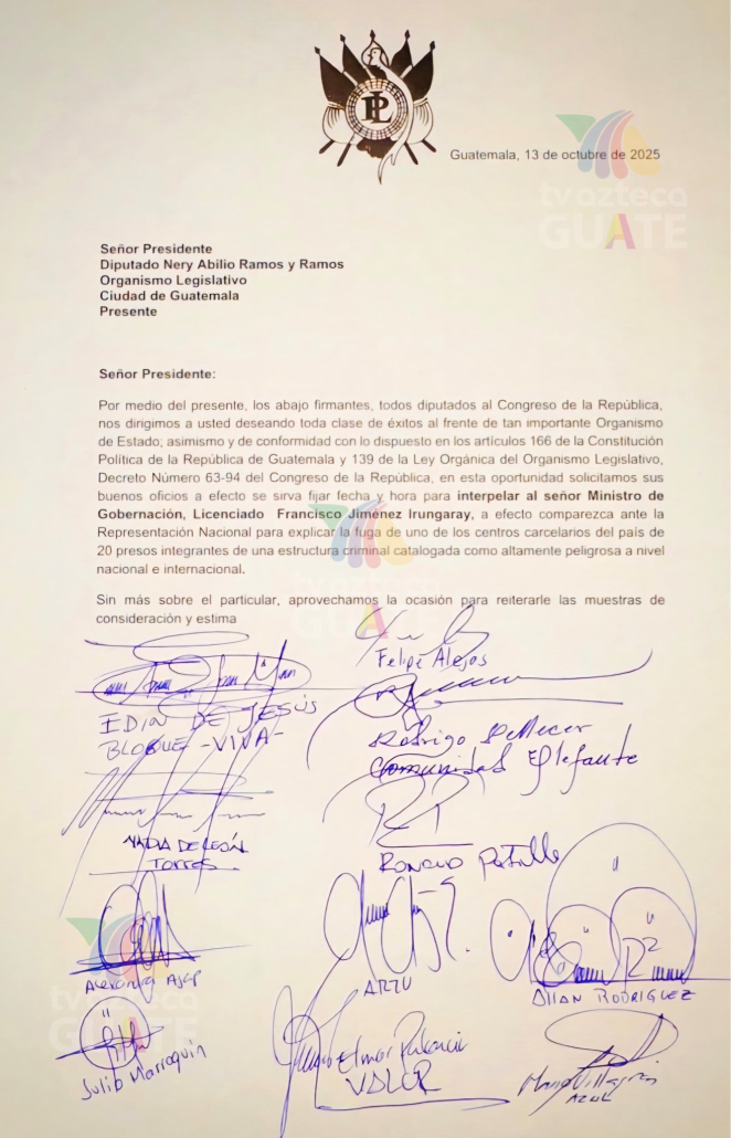 Una carta enviada por diputados de varios partidos solicitó a Nery Ramos la interpelación al ministro de Gobernación Francisco Jiménez, por la fuga de los criminales en la cárcel Fraijanes II. Hasta el momento, el presidente del Legislativo se limitó a «condenar enérgicamente» el hecho, que según dijo «pone en alto riesgo a los guatemaltecos».