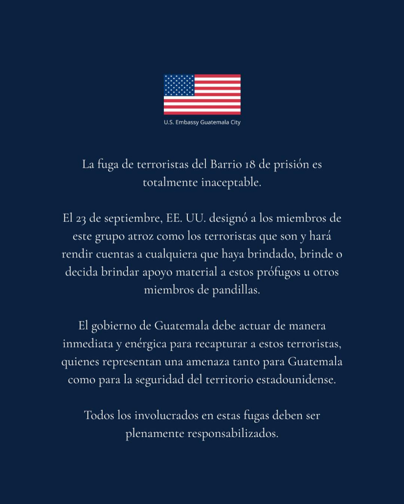 “El gobierno de Guatemala debe actuar de manera inmediata y enérgica para recapturar a estos terroristas, quienes representan una amenaza tanto para Guatemala como para la seguridad del territorio estadounidense”, advirtió la Embajada.