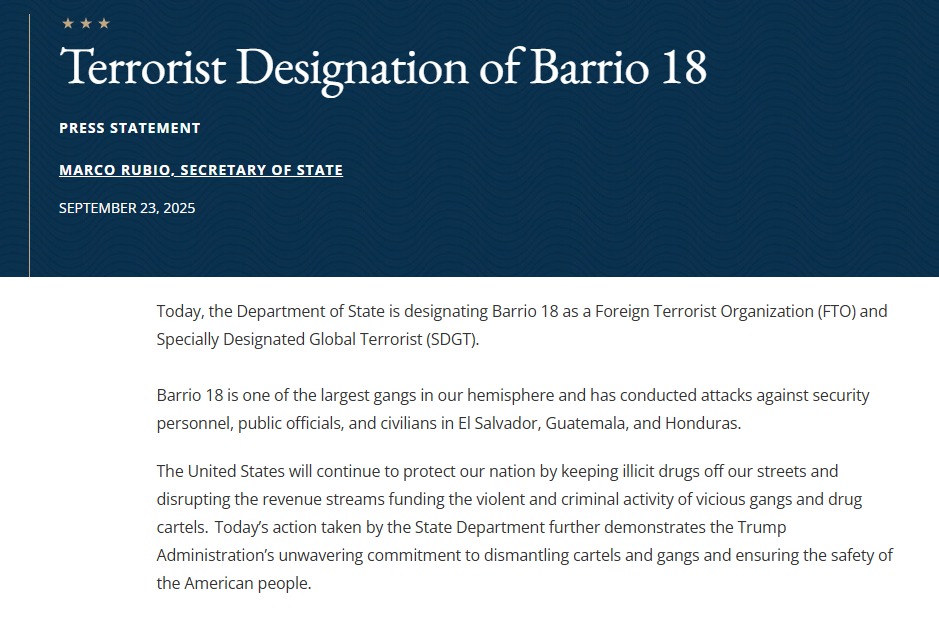 El Departamento de Estado de Estados Unidos anunció este martes la designación de la pandilla Barrio 18 como organización terrorista extranjera (FTO) y terrorista global especialmente designado (SDGT).