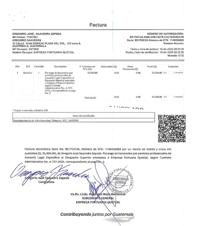El “cambio” también paga bien. Mientras hacía campaña para la elección del CANG para integrar la Comisión del TSE y se presentaba como la opción de la renovación, Goyo Saavedra cobraba Q35 mil mensuales como asesor legal de la Empresa Portuaria Quetzal y solo en los últimos dos meses de 2025 se embolsó Q70 mil.