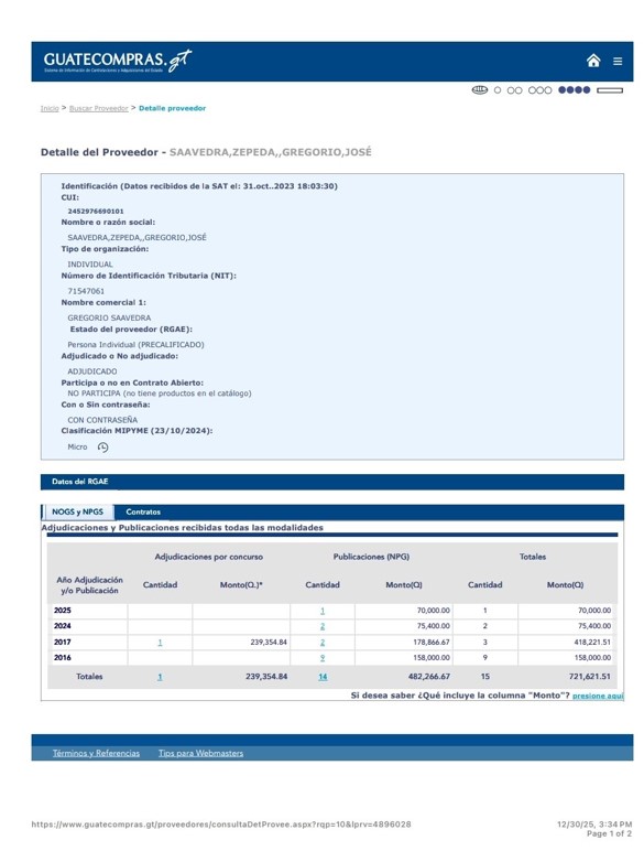 Los registros oficiales de Guatecompras y planillas de pago confirman que Goyo Saavedra, no es un recién llegado al aparato estatal. Por el contrario, figura como contratista del Estado desde al menos 2016, con adjudicaciones acumuladas que superan los Q720 mil, incluyendo contratos durante distintos gobiernos.