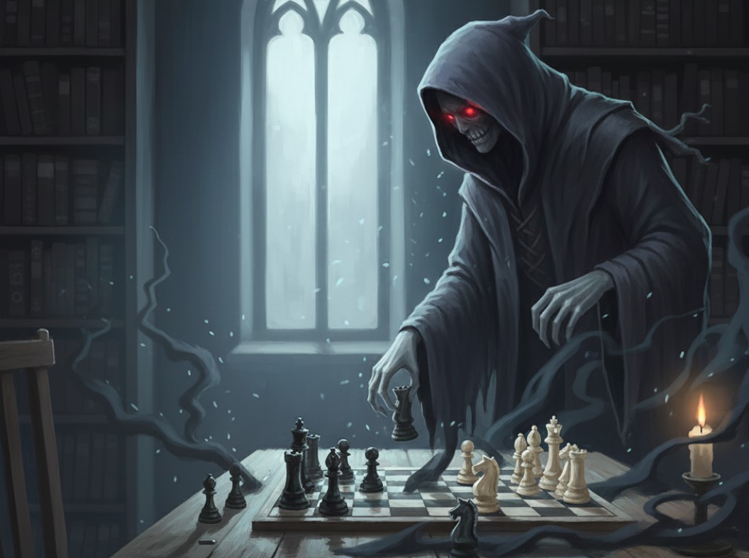 Su voz parecía envolver la habitación mientras jugaba con la guadaña y tomaba un peón blanco con dedos huesudos.