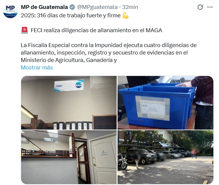 La Fiscalía Especial contra la Impunidad (FECI) del Ministerio Público ejecuta este miércoles cuatro diligencias de allanamiento, inspección, registro y secuestro de evidencias en distintas dependencias del Ministerio de Agricultura, Ganadería y Alimentación (MAGA), como parte de una investigación por presuntas anomalías en la adquisición de fertilizantes.