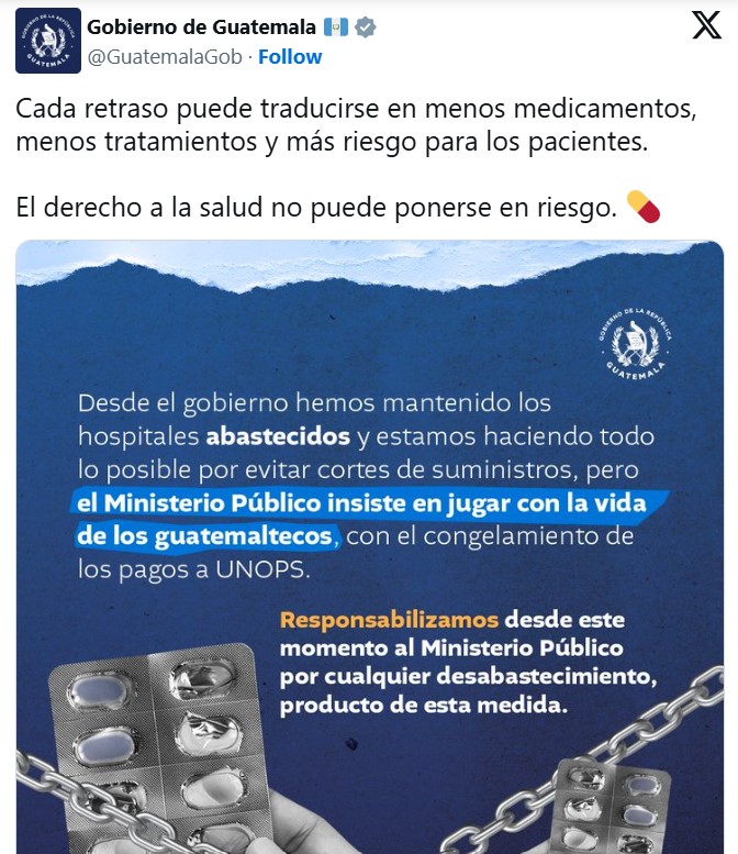 El mensaje, difundido por redes oficiales, llegó cargado de acusaciones: el Gobierno aseguró que “la Fiscalía juega con la vida de los guatemaltecos” y advirtió que cualquier interrupción en los suministros médicos sería consecuencia directa de la medida judicial.