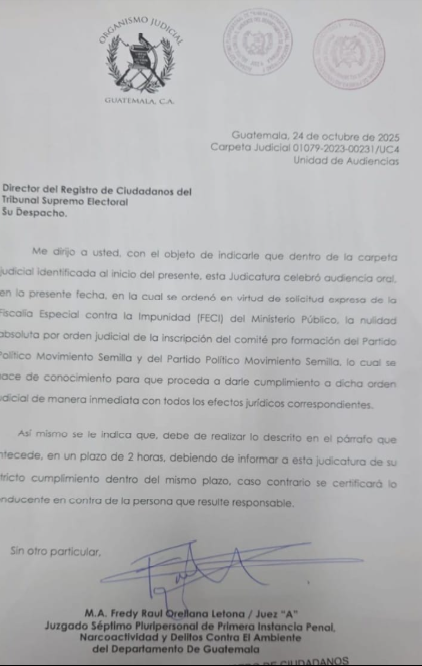 El comité pro formación de partido político que se constituyó con miles de firmas falsas, irregulares y hasta de difuntos, fue declarado en «nulidad absoluta» por el juez Fredy Orellana. Esto «eliminaría todo lo actuado» por dicho comité y el partido que llevó al gobierno a Bernardo Arévalo, lo que pone en aprietos a su gabinete, ya golpeado por la crisis en Gobernación luego de la fuga de reos y por el escándalo del contrato con UNOPS.
