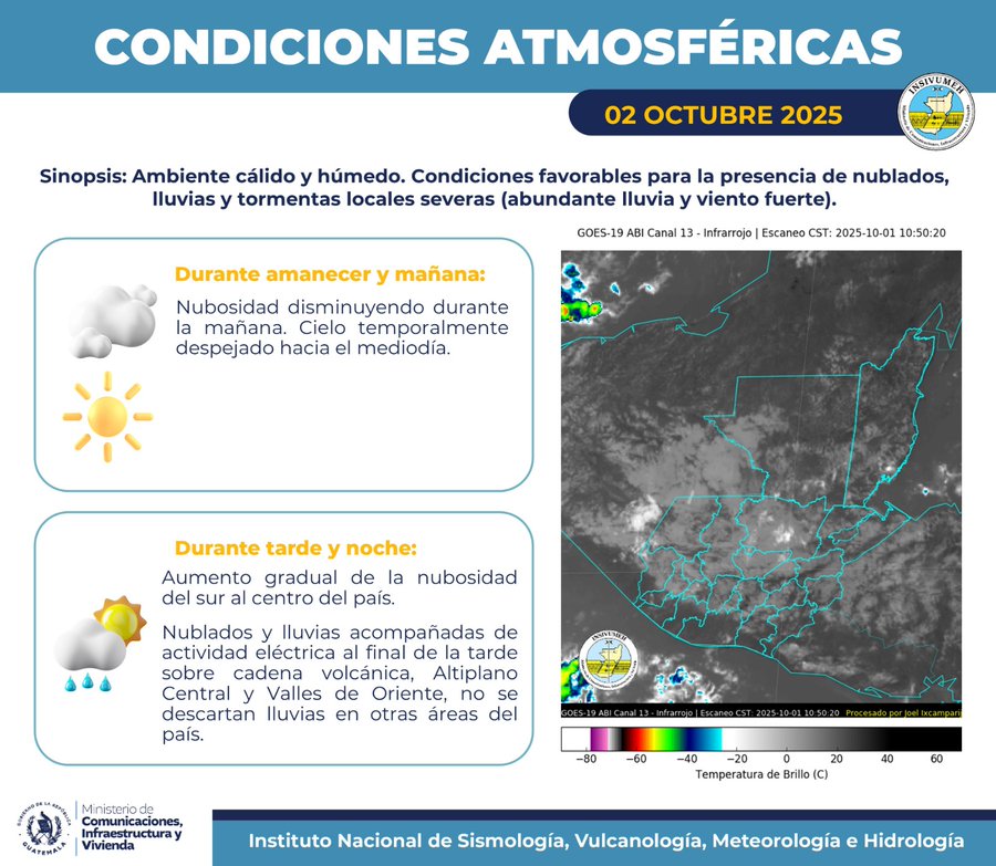 El Instituto Nacional de Sismología, Vulcanología, Meteorología e Hidrología (Insivumeh) advirtió que este jueves 2 de octubre se caracterizará por nubosidad, ambiente húmedo y lluvias acompañadas de actividad eléctrica en varias regiones del país.