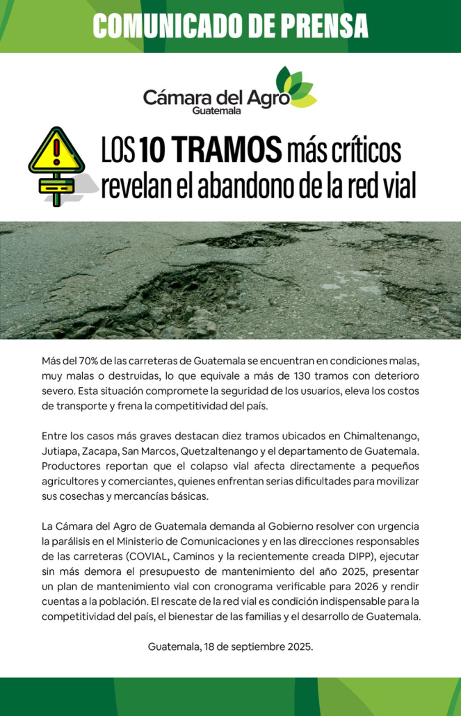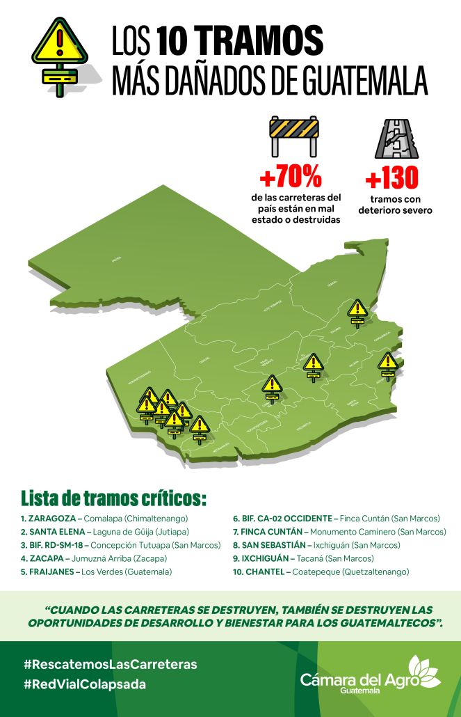 Más del 70% de la red vial en Guatemala se encuentra destruida o en pésimo estado, lo que representa más de 130 tramos con deterioro severo. Así lo advirtió la Cámara del Agro (Camagro), que publicó un informe señalando los 10 tramos más dañados del país, vitales para el comercio agrícola y el desarrollo local.