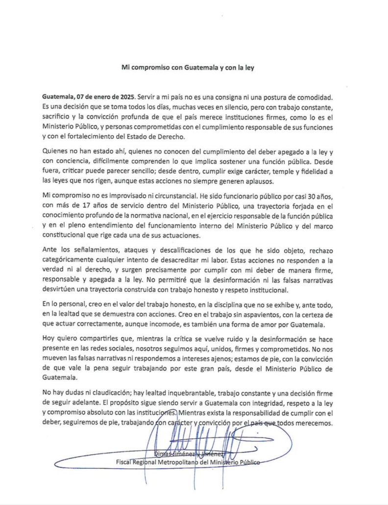 Para empezar, Dimas Jiménez está en Guatemala ejerciendo sus labores en el MP como lo hace hace 17 años. En el comunicado que divulgó, explica que hace 30 años ejerce como funcionario público y señaló: «no permitiré que las falsas narrativas desvirtúen una trayectoria construida con trabajo honesto y respeto institucional».
