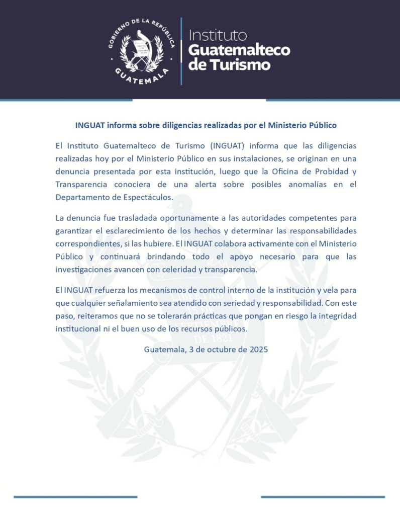 El Inguat confirmó en un comunicado que la diligencia se deriva de una denuncia presentada por la propia institución, luego de que la Oficina de Probidad y Transparencia detectara una alerta sobre posibles anomalías en el Departamento de Espectáculos.
