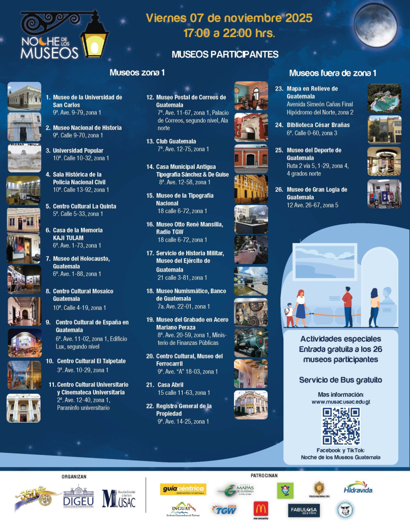 Algunos museos, como el Museo Numismático del Banco de Guatemala, el Museo Nacional de Historia o el Museo Postal de Correos, presentarán colecciones especiales que solo estarán disponibles durante esta noche.