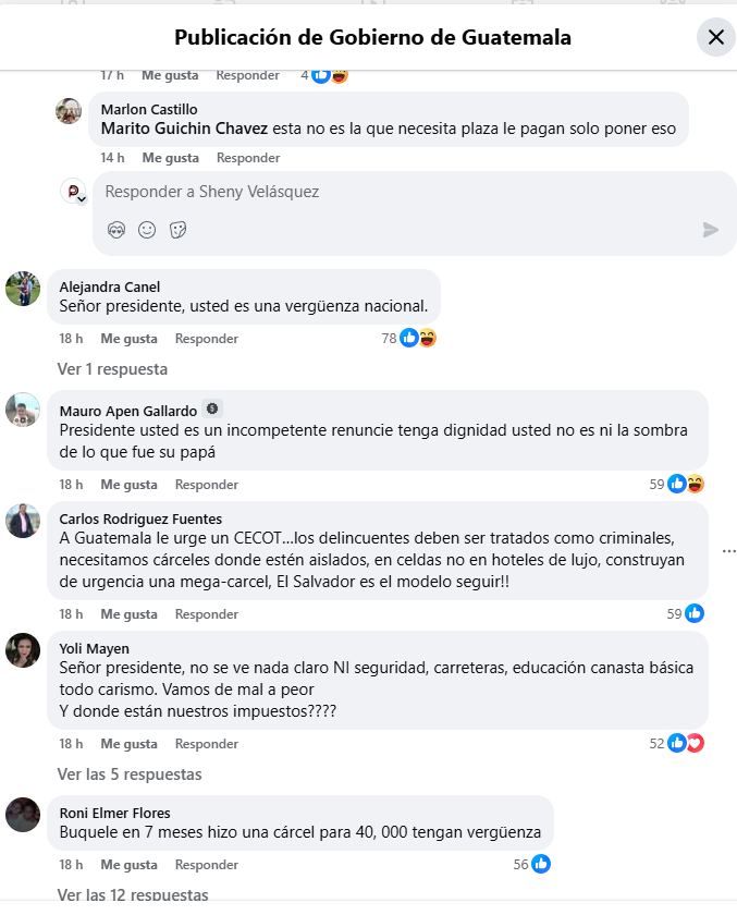 Con un alcance de casi 90 mil visualizaciones en X, la conferencia de prensa de Arévalo recibió 59 comentarios negativos y uno positivo. Similar panorama fue evidente en Facebook, con menor número y comentarios un poco más moderados.