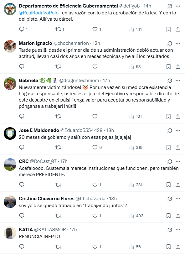 Algunos de los comentarios ciudadanos en redes demuestran el hartazgo de los guatemaltecos que ya comienzan a tomar como referente la administración de Nayib Bukele, lo que constituye una peligrosa advertencia en cuanto a que, del caos, el país podría convertirse en una dictadura, con la venia de un pueblo harto de corruptos, ineptos y falaces gobernantes.