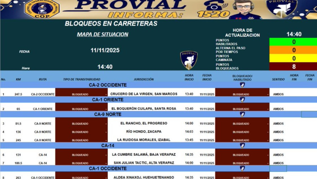CA-9 Norte, con bloqueos en El Rancho (El Progreso), Río Hondo (Zacapa) y La Ruidosa (Morales, Izabal).