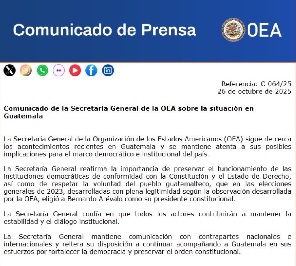 El documento de la OEA, fechado el 26 de octubre, llega pocas horas antes del discurso en cadena nacional de Bernardo Arévalo, en el que atacó directamente al juez Fredy Orellana, acusándolo de conspirar contra su gobierno y de servir a la fiscal general Consuelo Porras.