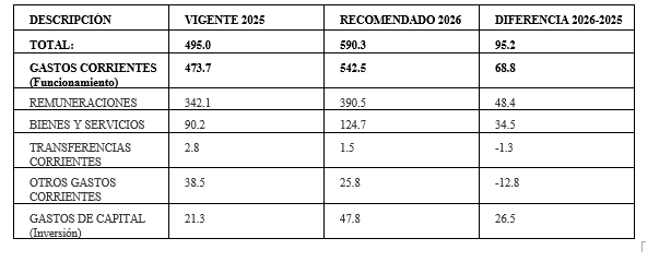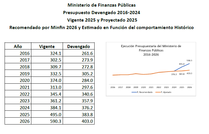 Para el 2026 el Ministerio de Finanzas Públicas colocó en el Proyecto de Presupuesto un requerimiento de gasto de Q590.3 millones, monto que supera en Q95.2 millones el monto vigente a octubre de 2025. Si comparamos el monto requerido respecto al monto aprobado para 2025; Q505.0 millones, o respecto al vigente, representa un aumento del 16.9% o de 19.2%, según se compare.