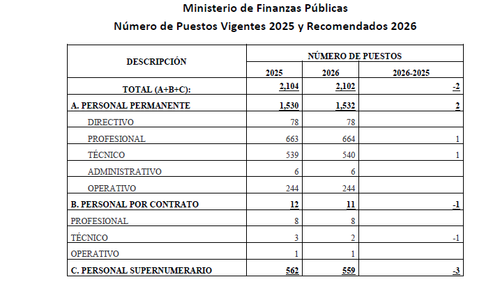 En este sentido, para 2026 se contemplan Q6,563.0 millones en remuneraciones y Q7,193.3 millones en bienes y servicios. Respecto a las remuneraciones, cabe destacar que no se plantea un incremento significativo de personal, ya que en 2025 se tienen 62,684 personas, mientras que para 2026 se plantean 62,697, un aumento de 13 personas.