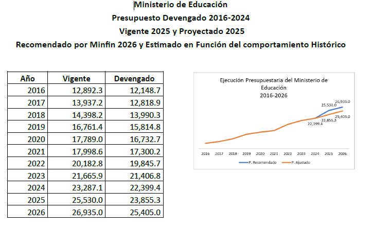 Bajo este contexto y tomando de base el comportamiento histórico de la ejecución del Mineduc, se puede determinar que el cierre 2025 estaría en aproximadamente Q23,855.3 millones, por lo que el presupuesto necesario para 2026, tomando una tasa promedio de crecimiento del 6.5% anual (promedio entre 2026 a 2024), sería de Q25,405.0 millones, es decir una disminución de Q1,530.0 millones respecto a lo planteado por el Organismo Ejecutivo.