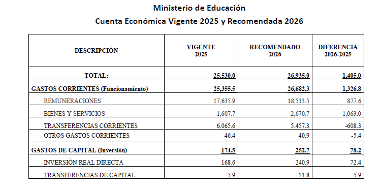 Desglosando el presupuesto del Ministerio de Educación, es lógico que las remuneraciones representen el mayor porcentaje del gasto de esta entidad, sin embargo, también es oportuno indicar que el comportamiento de ejecución en este rubro muestra que tanto para 2025 como para 2026 el monto programado en remuneraciones se encuentra sobre estimado, salvo que el Organismo Ejecutivo esté contemplando un considerable aumento como consecuencia de la firma de un nuevo pacto colectivo.