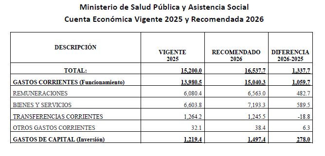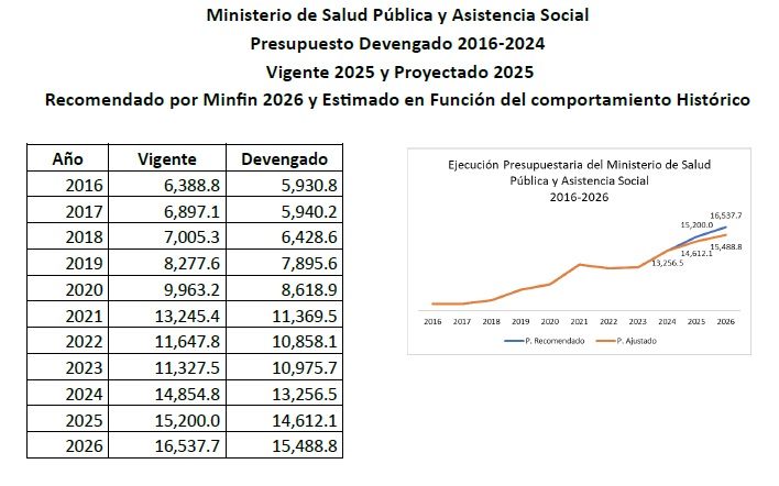 Otro de los Ministerios relevantes, tanto por el beneficio que pueden aportar a la sociedad, como por el monto de presupuesto que se le asigna es el Ministerio de Salud Pública y Asistencia Social (MSPAS). En este sentido, para 2026 la Presidencia ha requerido un presupuesto en favor del MSPAS de Q16,537.7 millones, teniendo un incremento de Q1,337.7 millones con relación al presupuesto vigente a octubre de 2025.