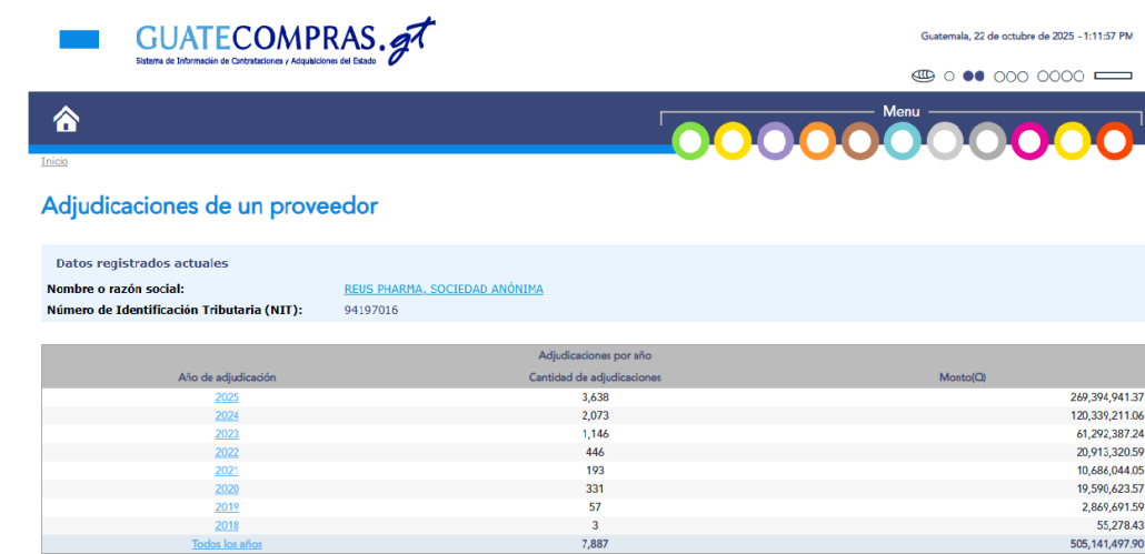 Pronto, la empresa se convirtió en uno de los principales proveedores del IGSS, que de otorgarle 3 adjudicaciones en 2018, pasó a 3,637 adjudicaciones este año. El total de adjudicaciones del IGSS a Reus Pharma al momento es de Q505,141,497.90 en estos años, como se observa en Guatecompras.