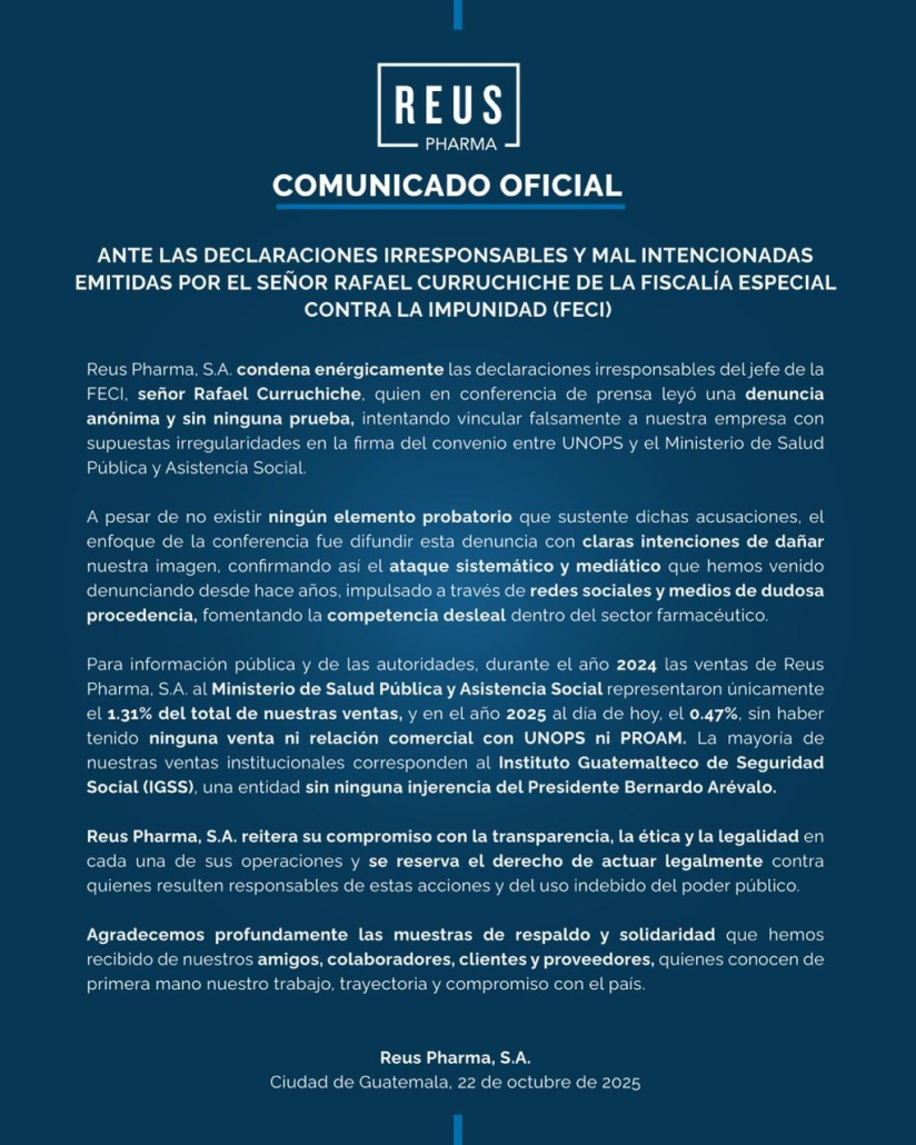 Un comunicado de la empresa Reus Pharma, S.A., califica de «irresponsables y malintencionadas» las declaraciones de Rafael Curruchiche, jefe de la FECI, y asegura que los señalamientos se realizaron para desprestigiar a la empresa, «sin ninguna venta ni relación comercial con UNOPS o PROAM, aunque según Guatecompras, el día de ayer le fue adjudicado un contrato en el que PROAM aparece como «unidad compradora».