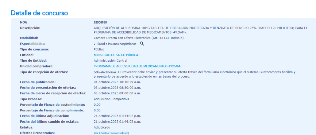 Sin embargo, una muy pequeña adjudicación a la farmacéutica se realizó ayer 21 de octubre, y el comprador fue el Programa de Accesibilidad de Medicamentos (PROAM). Por pequeño que sea este negocio para una empresa tan enorme, queda claro que la relación comercial entre MSPAS y Reus Pharma sí existe y esto consta en Guatecompras.