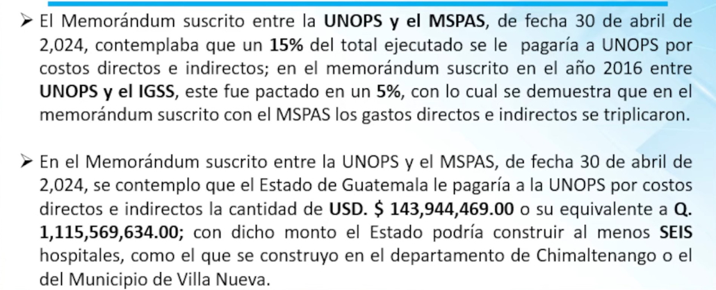 En los convenios comparados, mientras Unops cobraba un 5% de costos indirectos en procesos con el IGSS, en el acuerdo con Salud ese porcentaje subió a 15%, un aumento que triplicó las cargas sin explicar beneficios.