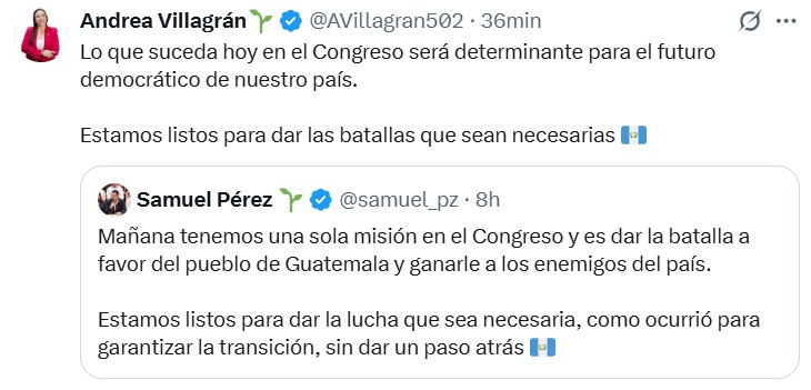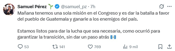El diputado Samuel Pérez afirmó que “mañana tenemos una sola misión en el Congreso y es dar la batalla a favor del pueblo de Guatemala y ganarle a los enemigos del país”. En redes sociales, agregó que el bloque oficialista está “listo para dar la lucha que sea necesaria, como ocurrió para garantizar la transición, sin dar un paso atrás”.