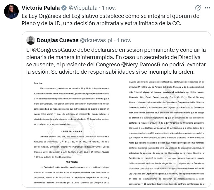 La diputada Victoria Palala, del extinto Semilla, se sumó a las críticas hacia la CC, calificando la resolución como una “decisión arbitraria y extralimitada”. Según señaló, “la Ley Orgánica del Legislativo establece cómo se integra el quórum del Pleno y de la Junta Directiva”, por lo que la Corte estaría interfiriendo en funciones que corresponden únicamente al Congreso.