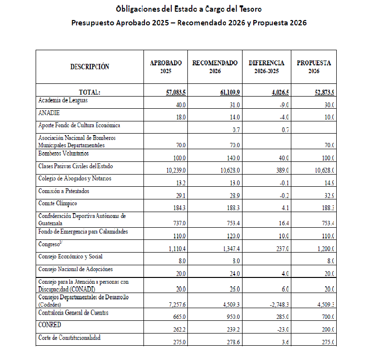 En conjunto, para 2026 tienen un presupuesto solicitado de Q2,471.5 millones, mientras que a octubre de 2025 su presupuesto vigente asciende a Q2,204.2 millones, lo que implica que hay un incremento de Q267.2 millones.