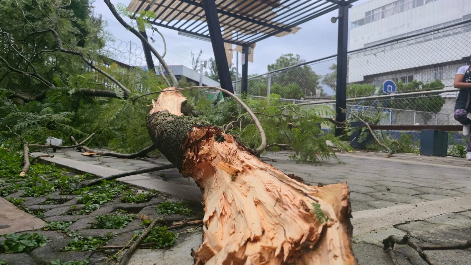 En la zona 11 capitalina, los fuertes vientos afectaron el área del Centro Universitario Metropolitano (CUM), donde se reportaron árboles caídos, mobiliario volando y ventas informales destruidas.