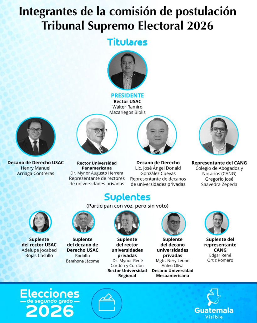 La comisión que nominará a 20 candidatos, de los que el Congreso elegirá, con 107 votos, a cinco magistrados al Tribunal Supremo Electoral (TSE), terminó de integrarse ayer, cuando el Colegio de Abogados y Notarios de Guatemala (CANG), realizó la segunda vuelta, en la que resultó ganadora la Planilla 4, de clara orientación oficialista, con Gregorio Saavedra como titular y cuyo suplente Edgar Ortiz también es asesor jurídico de la Fundación Libertad y Desarrollo de Dionisio Gutiérrez.