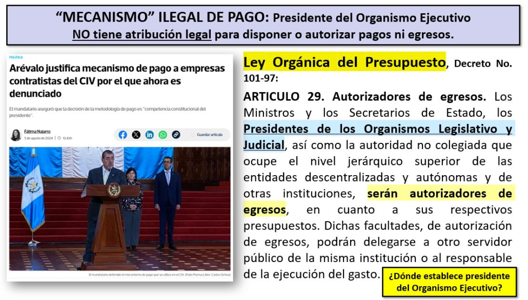 El presidente del Organismo Ejecutivo NO tiene atribución legal para disponer o autorizar pagos ni egresos de los contratistas de obra del Estado; pagar es responsabilidad exclusiva de cada ministerio.