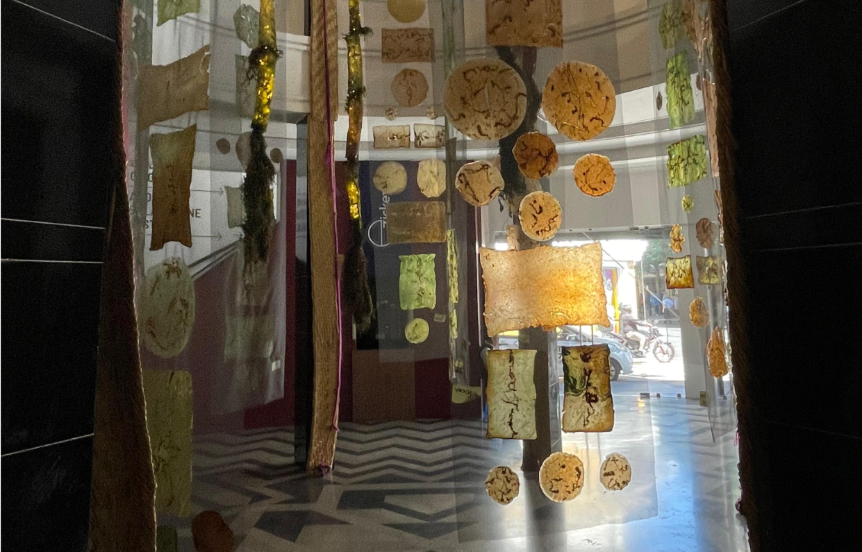 La distribución de los resultados dentro del espacio expositivo es bastante peculiar, los distintos tonos de color trabajados con una celulosa natural —biopieles—  que la artista ha creado en su propio estudio a partir del estudio minucioso de la química que puede derivarse sin ningún efecto contraproducente al medio ambiente, le dan un resultado de color translúcido, una suerte de vitral elástico que está adherido a las ventanas como alimentándose de la luz solar; estos tejidos tienen un mensaje cifrado en clave morse, un recurso que me parece lógico si entendemos que este tipo de lenguaje se inventó para que pudiera viajar a mayor velocidad a través de los cables telegráficos. Por otra parte, está el móvil de ocho metros de alto  construido de materiales elaborados a partir de una planta acuática invasora conocida como hidrila, que desde distintos ángulos pueden ser vistos como una cadena ARN de información genética en el que se contienen todos los catalizadores biológicos y que se extienden desde el inicio mismo de la vida sobre el planeta, esta escultura nos remite a las capas invisibles que crecen hacia el interior del lago en una suerte de enfermedad y resiliencia ante el efecto nocivo de los factores externos, este espacio mistifica el oxígeno que puede regenerar la vida y reducir el deterioro; cada fragmento de biopiel o biocuero fue fabricado artesanalmente por Verónica y cosido hasta crear un enorme ensamble que se sostiene desde la cúpula del Teatro Lux hasta la entrada principal, atravesando verticalmente el espacio del Centro Cultural de España en Guatemala. Por otro extremo de la sala tenemos un importante diagrama de trabajo, esto me parece lo más importante de toda la muestra, porque traslada a la pared todo su proceso de conexiones y apuntes, acaso la parte fundamental de este experimento artístico esté dentro de esos apuntes en los que señala los nombres de las comunidades y el mapa del lago, junto a los diferentes problemas que enfrenta, problemas que van desde el pésimo manejos de los desechos, la contaminación de los vehículos acuáticos y la desidia de las autoridades que a lo largo de décadas de olvido han optado por ver hacia otro lado.